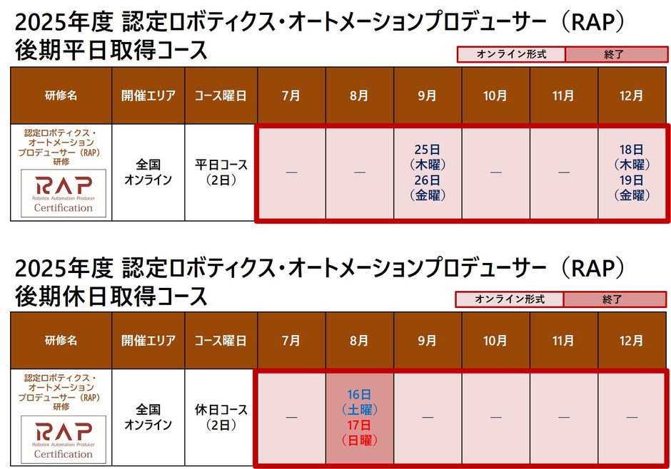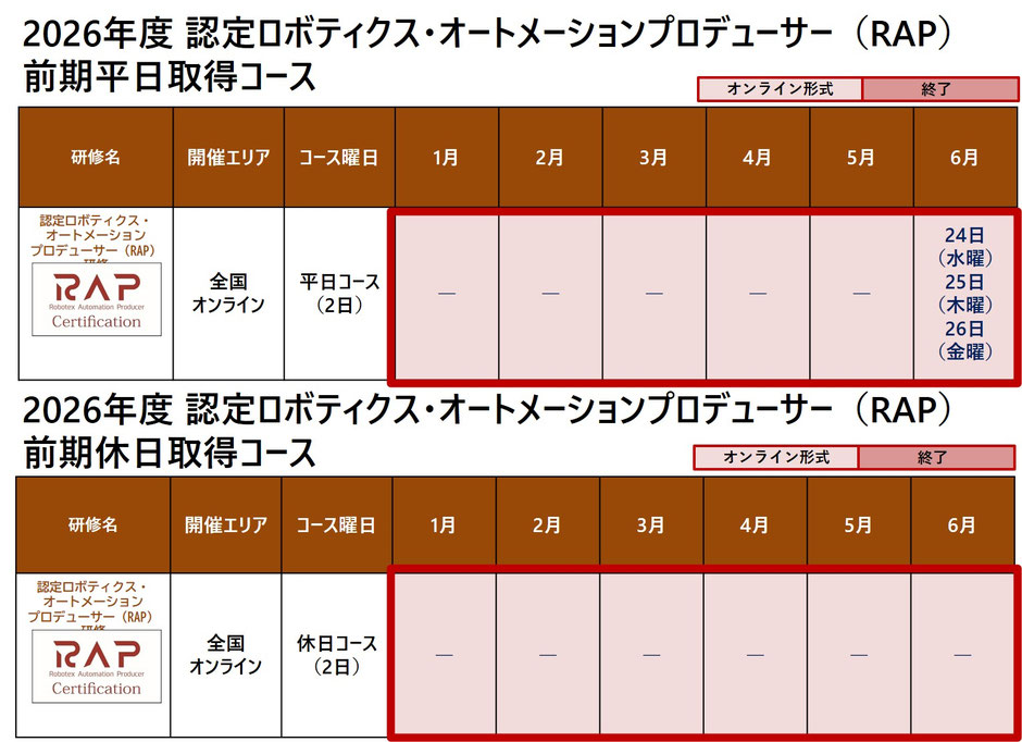 2025年度後期、2026年度前期の認定ロボテックス・オートメーションプロデューサー(RAP)資格取得に関する研修試験情報を公開しております。以下の当協会申し込みサイトよりお申込みください。全国どこからでも研修試験が可能なオンラインとなります。申し込み方法は以下の各レベル毎の申し込みバリエーション(試験日程)から選択してお申込みください。