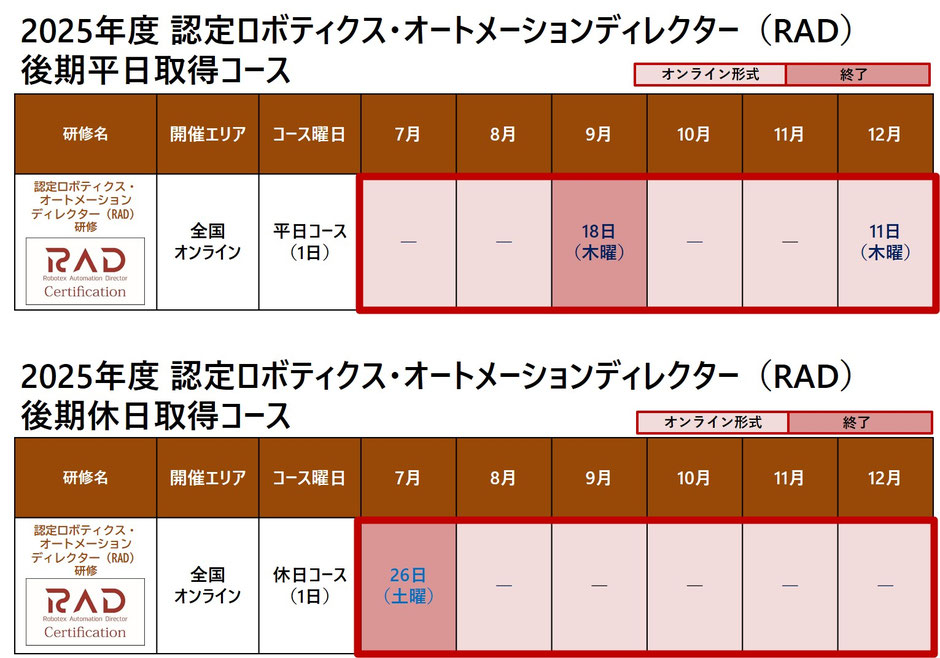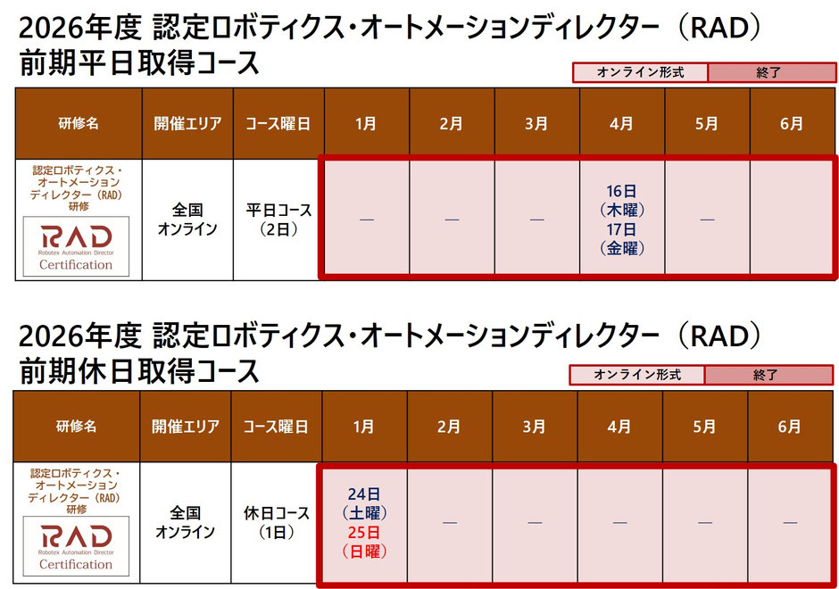2025年度後期、2026年度前期の認定ロボテックス・オートメーションディレクター(RAD)資格取得に関する研修試験情報を公開しております。以下の当協会申し込みサイトよりお申込みください。全国どこからでも研修試験が可能なオンラインとなります。申し込み方法は以下の各レベル毎の申し込みバリエーション(試験日程)から選択してお申込みください。